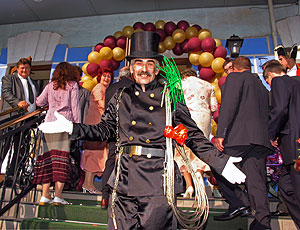 Но тут раздаются взволнованные крики: “Едут!” Еще раз подкрашиваем Николе щеки, утягиваем пояс, оправляем сюртук и — в путь, навстречу лимузину… * * * …Когда первый шок прошел, невеста потянулась к украшенной пуговице, сразу бросающейся в глаза на фоне обычных медных. Раз! — и с сюртука она перекочевала в тонкие пальцы новобрачной. Теперь нужно пройти пару шагов под ручку, но жених заупрямился: наверное, не захотел отпускать Татьяну одну с таким импозантным мужчиной! Но после секундного колебания все же сдался. “Ершик отними, Татьяна!” — раздаются со всех сторон крики гостей, но невеста, засмущавшись, поскорее вернулась “под крылышко” жениха.