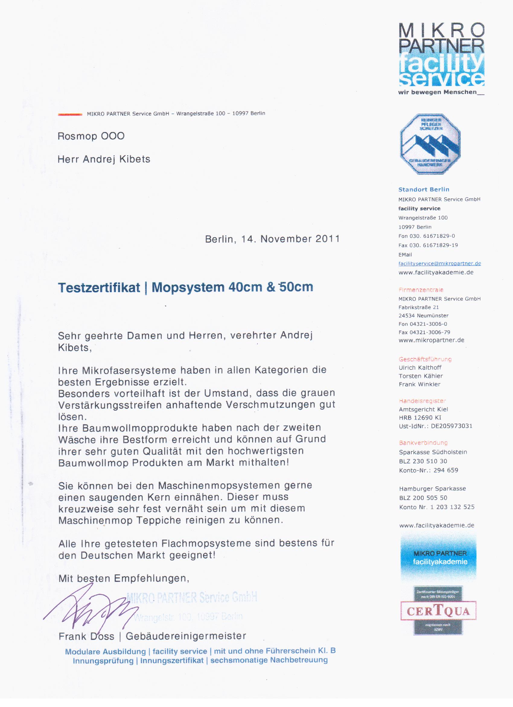 Немецкий эксперт и руководитель учебного центра Франк Досс (Frank Doss) провел тестирование мопов производства компании РОСМОП, на основании чего и предоставил свой отзыв.